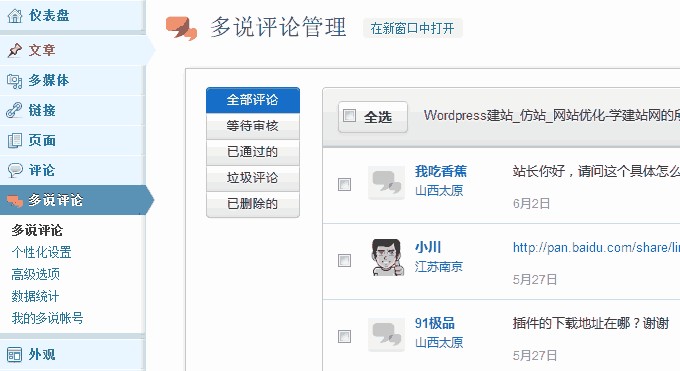 3、不用在单独安装评论回复、同步到QQ空间、垃圾过滤、最新评论、最新访客、热评文章等N多插件;