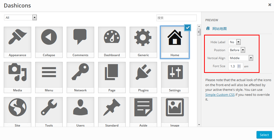 3、点击Select选择你喜欢的图标就可以了,选择的时候我们可以根据自己的模板风格设置对其方式、图标大小等: