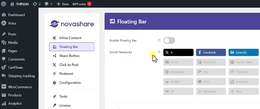 好安装成功以后,然后我们去激活这个插件,好,激活以后我们在 settings里面我们可以看到就多出来一个Novashare,然后我们点击打开,这样我们就进入了它的设置界面。