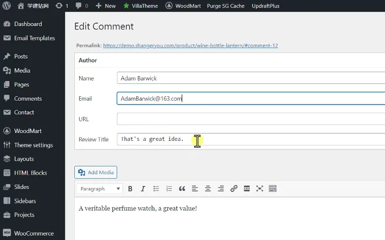 这是我们之前导入的,然后点击编辑,那么他的名字,他的邮箱,包括他的URL,还有他评价的标题,评价的内容,然后是否推荐我们可以点击推荐我们的商品,然后另外一个是否置顶,是否验证这个验证是什么意思,就是我们之前给大家讲过了,就是在我们的独立站当中有两种客户,一种客户就是已经购买了我们的商品,一种是没有购买的,没有购买的正常情况下,如果你在无框门里面去设置,也可以评价,那么用户他也是可以发表评论的。比如说我们找到woocommerce,然后找到settings,然后找到我们的产品products,在products里面我们可以看到这里我们看到有一个评价的设置,上面两个针对产品都可以看到我们的评价。