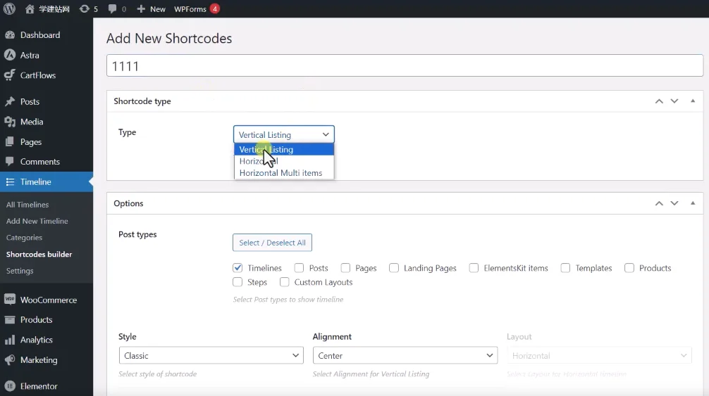 那么另外一种方式就是它可以调用wordpress默认的这里面的内容,比如说我们点击打开一个add new,他可以选择除了timeline,我们默认去创建的之外,它也可以把我们整个页面里面的文章或者是我们的页面,或者是我们的一些模板,包括我们的产品直接调用成我们时间轴上面的内容,所以这就是掌握时间轴使用的两个模块。