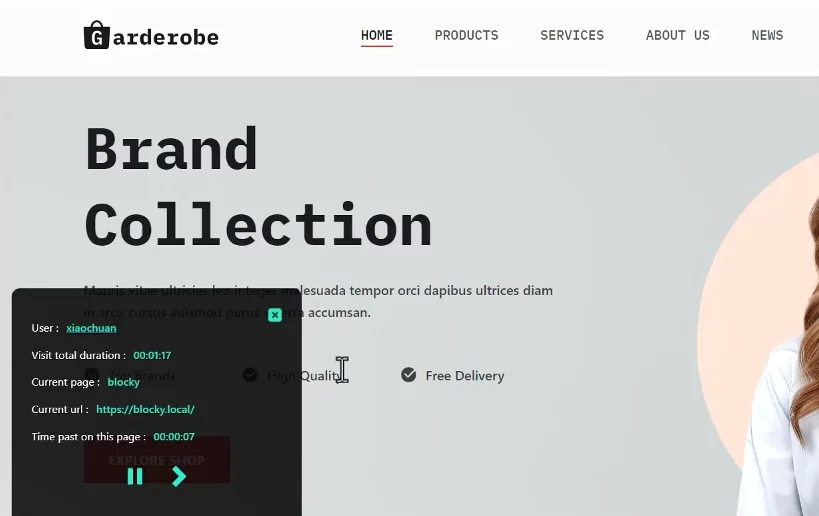 然后我们现在就可以点击查看用户的行为轨迹,然后在我们的左下角就会看到一个路径,这个路径就是一个幻灯片的方式,首先用户进入了第一页,然后在第一页停留了7秒钟,然后进入下面的页面,然后又停留29秒,然后进入我们的某一个商品,它会自动播放,如果你想快一点就点击这个按钮下,一个我们要进入的就是我们的购物栏,然后通过购物栏用户又会进入到我们的 checkout的页面停留了两秒钟,然后又进入了我们的about的页面,它就把整个路径给记录下来了。
